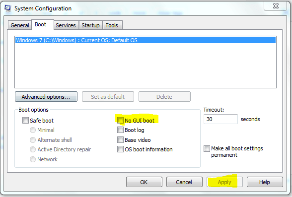 Step 4: Checkmark on NO GUI BOOT and Click Apply.